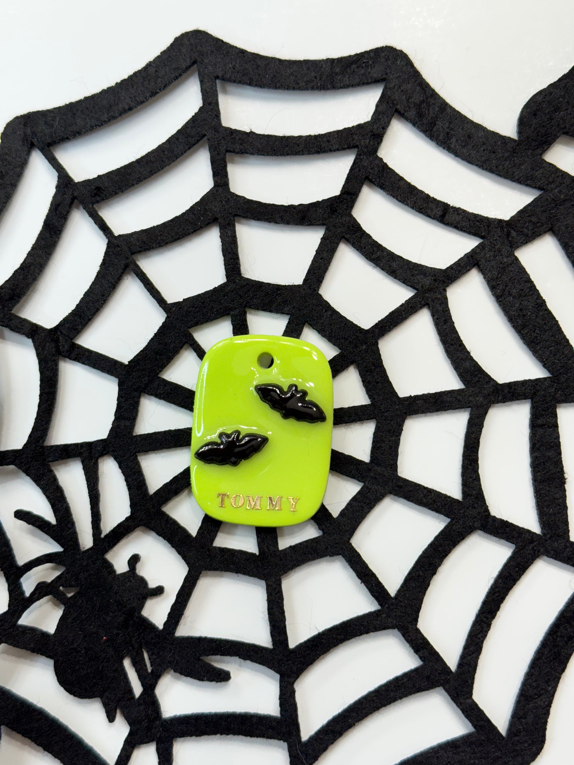 Boo pet tag is a clay and resin dog tag with gold hardware.