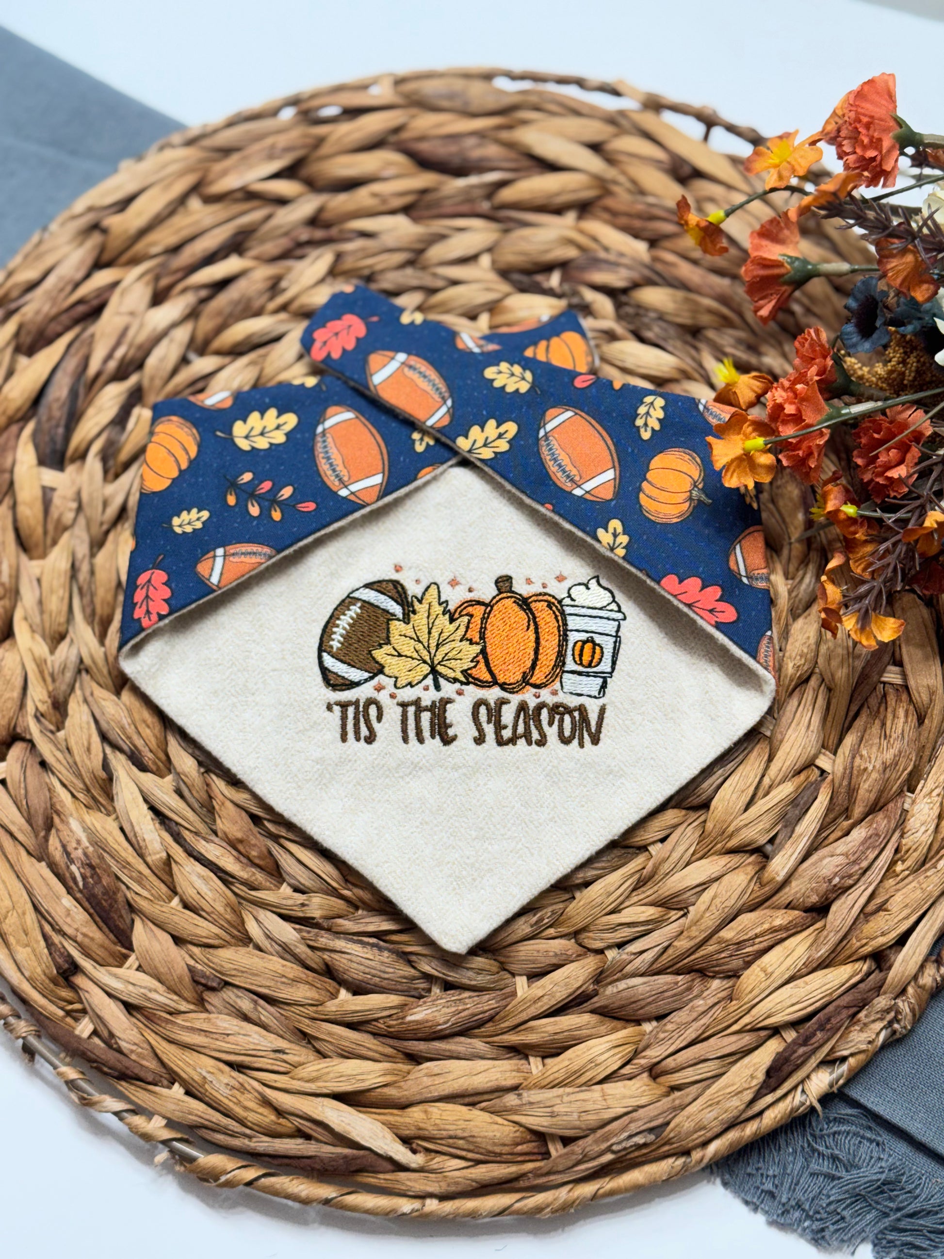 Reversible Embroidered dog bandana. Actual colors may vary slightly from what appears online. Design placement does vary on each bandana!